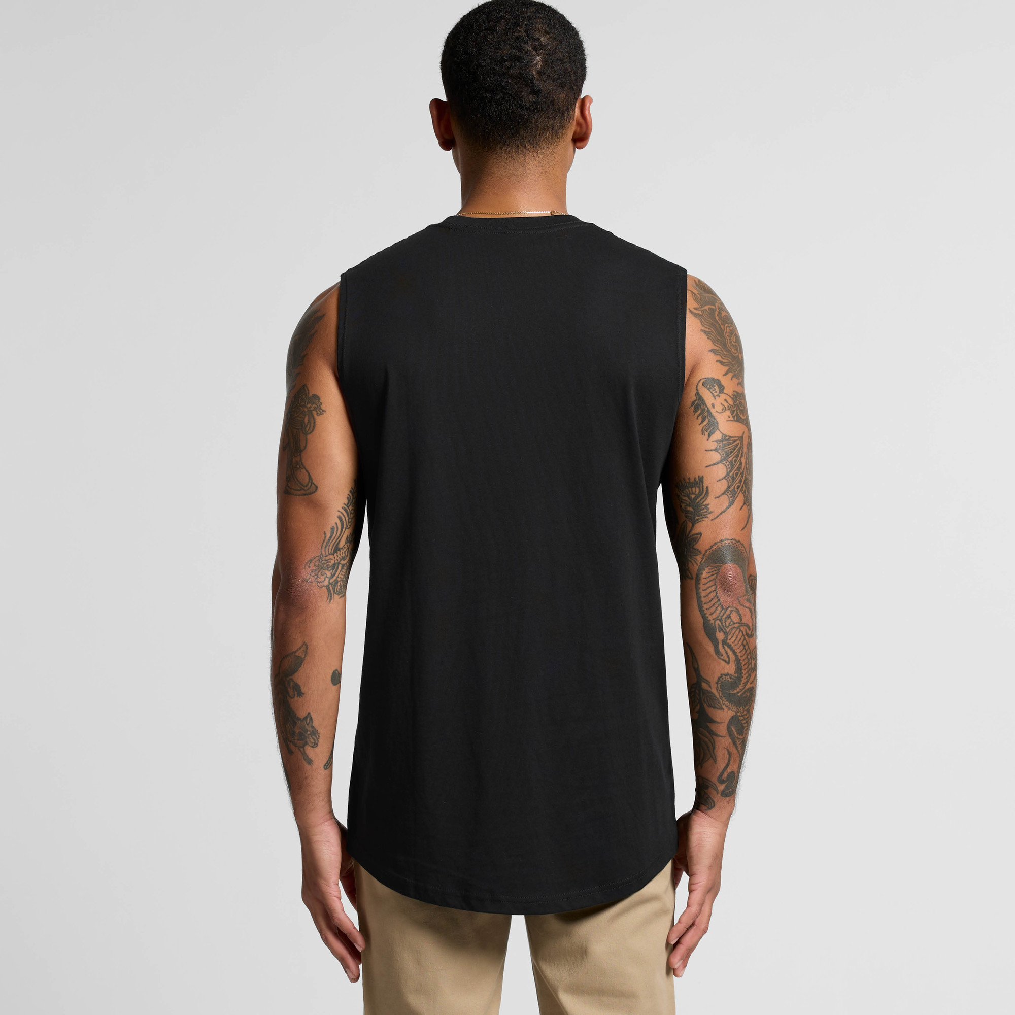 Crew neck, curved hem, sleeveless tank, hemmed armhole edges